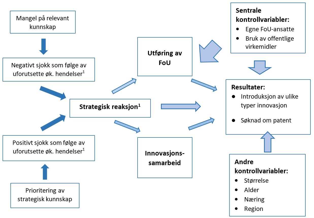 I denne analysen ser vi først på hvordan norske foretak opplevde og rapporterte virkninger av uforutsette økonomiske hendelser, som pandemien og andre hendelser i perioden 2020–2022. Deretter presenterer vi en statistisk strukturell modell som forklarer hvordan slike hendelser – både negative og positive – henger sammen med foretakenes strategiske valg, som å finne nye kunder eller markeder og bygge eksterne relasjoner. Videre viser modellen hvordan foretakets strategiske valg samspiller med bruk av virkemidler, foretakets FoU-aktiviteter, innovasjonssamarbeid og resultater i form av nye produkter, forretningsprosesser og patent- og varemerkesøknader.